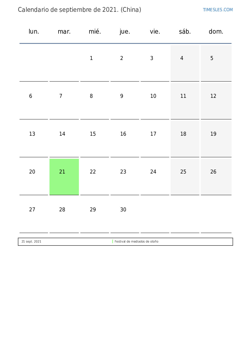 Calendario de feriados y fines de semana de septiembre de 2021 para China