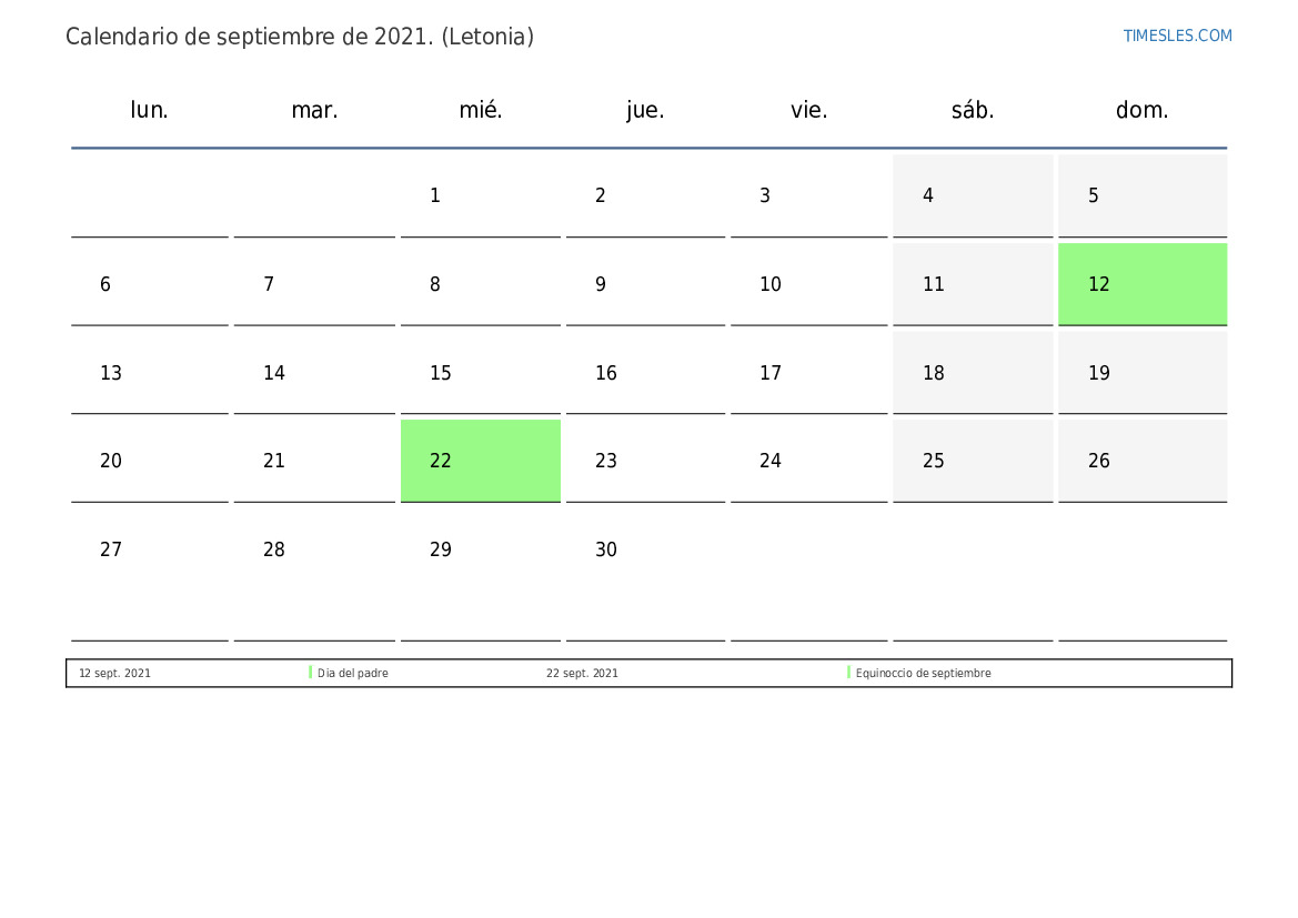 Calendario de feriados y fines de semana de septiembre de 2021 para Letonia