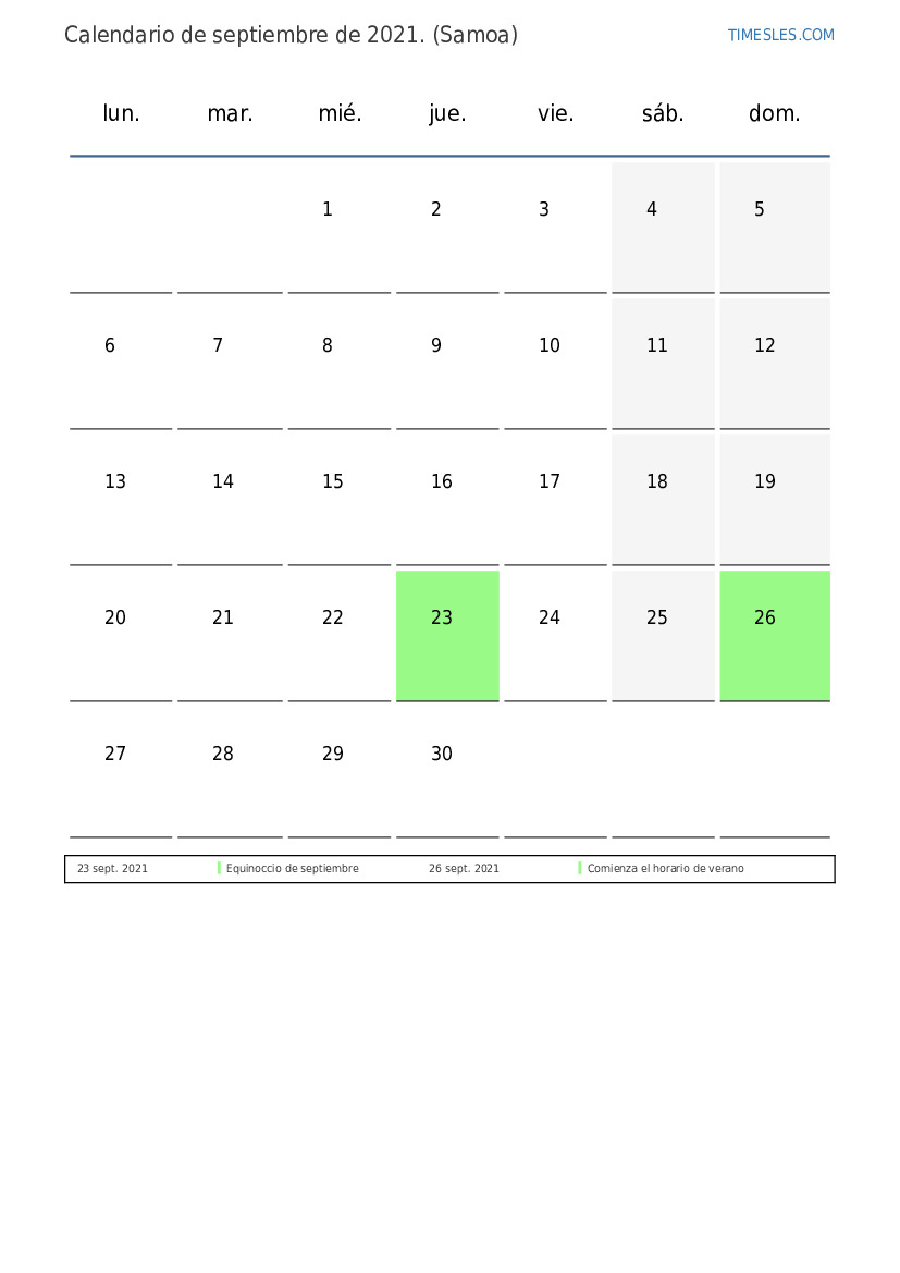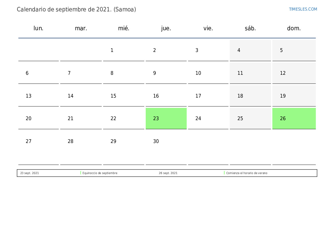 Descargue e imprima el calendario en PDF con feriados y fines de semana de septiembre de 2021 para Samoa