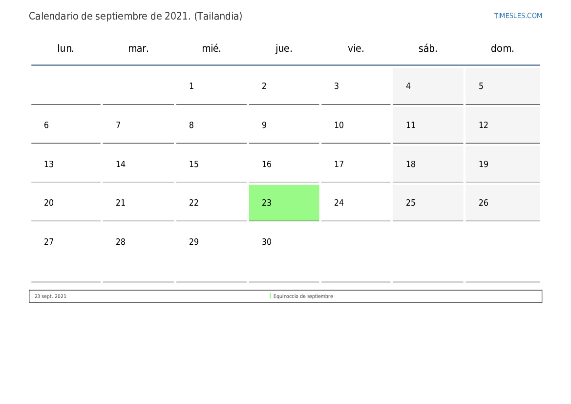 Calendario de feriados y fines de semana de septiembre de 2021 para Tailandia
