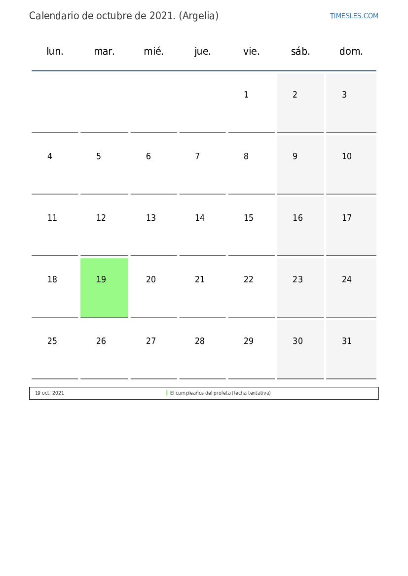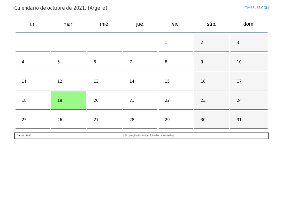 Calendario de feriados y fines de semana de octubre de 2021 para Argelia