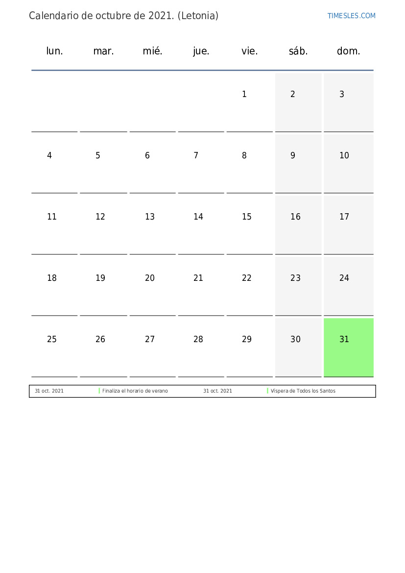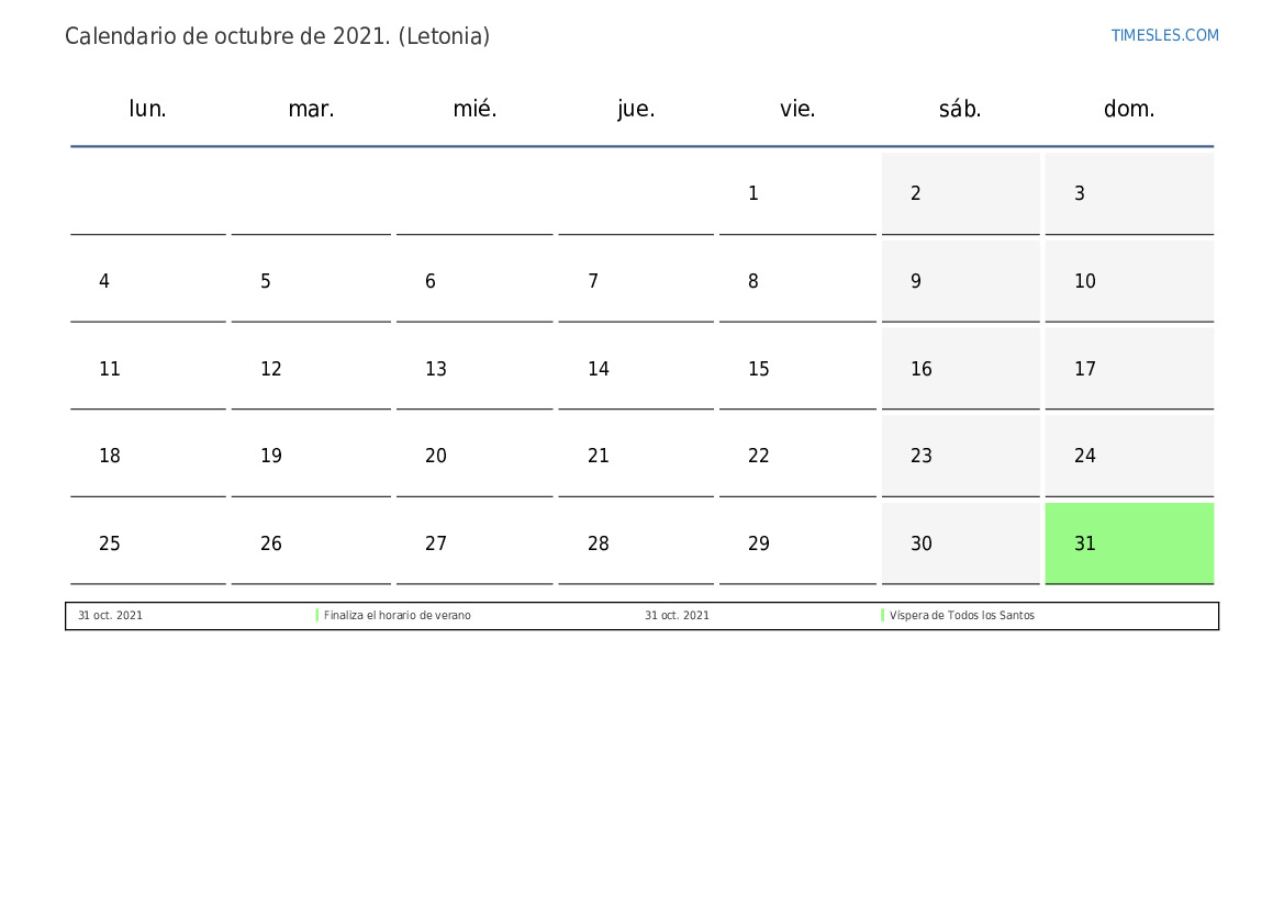 Calendario de feriados y fines de semana de octubre de 2021 para Letonia