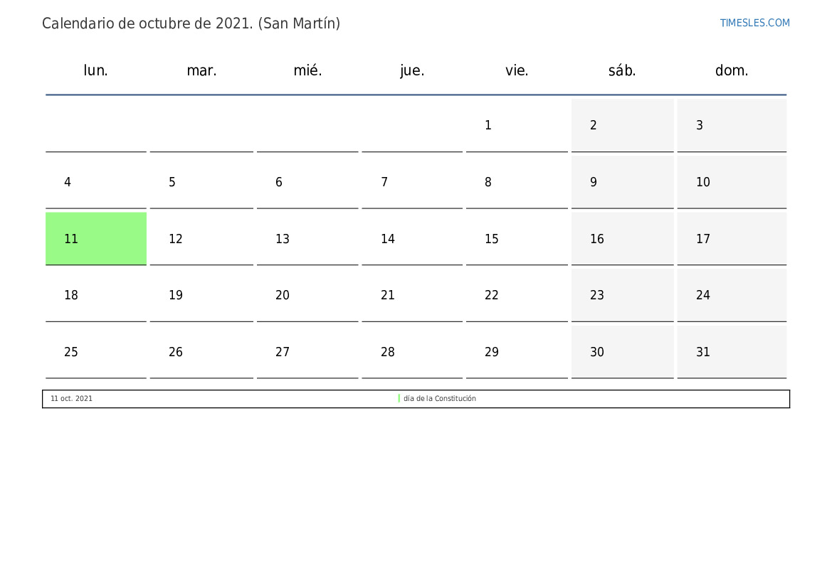 El mes de octubre contiene 31 días. Este es 10 mes de 2021. Temporada del año: otoño. El mes de octubre comienza el viernes y termina el domingo. En el mes de octubre de octubre, hay 1 feriado y día libre en Sint Maarten.