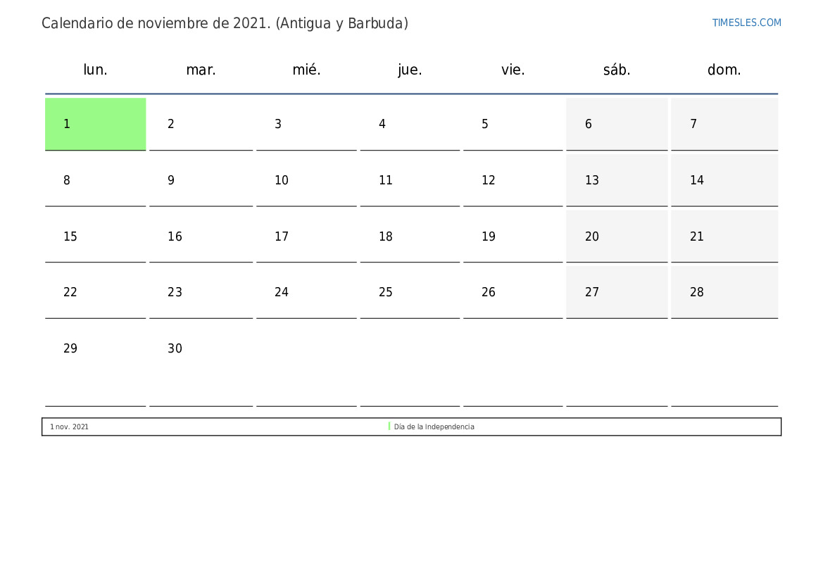 Calendario de feriados y fines de semana de noviembre de 2021 para Antigua y Barbuda
