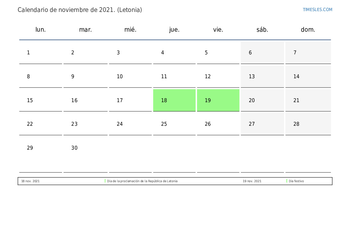 Calendario de feriados y fines de semana de noviembre de 2021 para Letonia