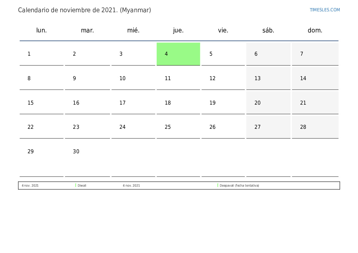 El mes de noviembre contiene 30 días. Este es 11 mes de 2021. Temporada del año: otoño. El mes de noviembre comienza el lunes y termina el martes. En el mes de noviembre de noviembre, hay 2 feriados y días libres en Myanmar.