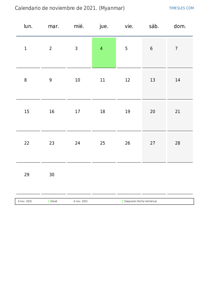 Calendario noviembre 2021 para Myanmar