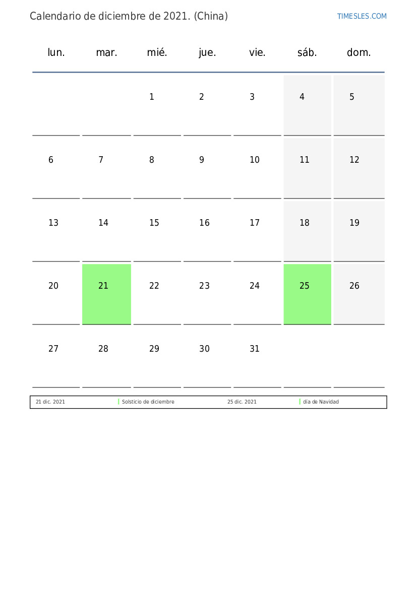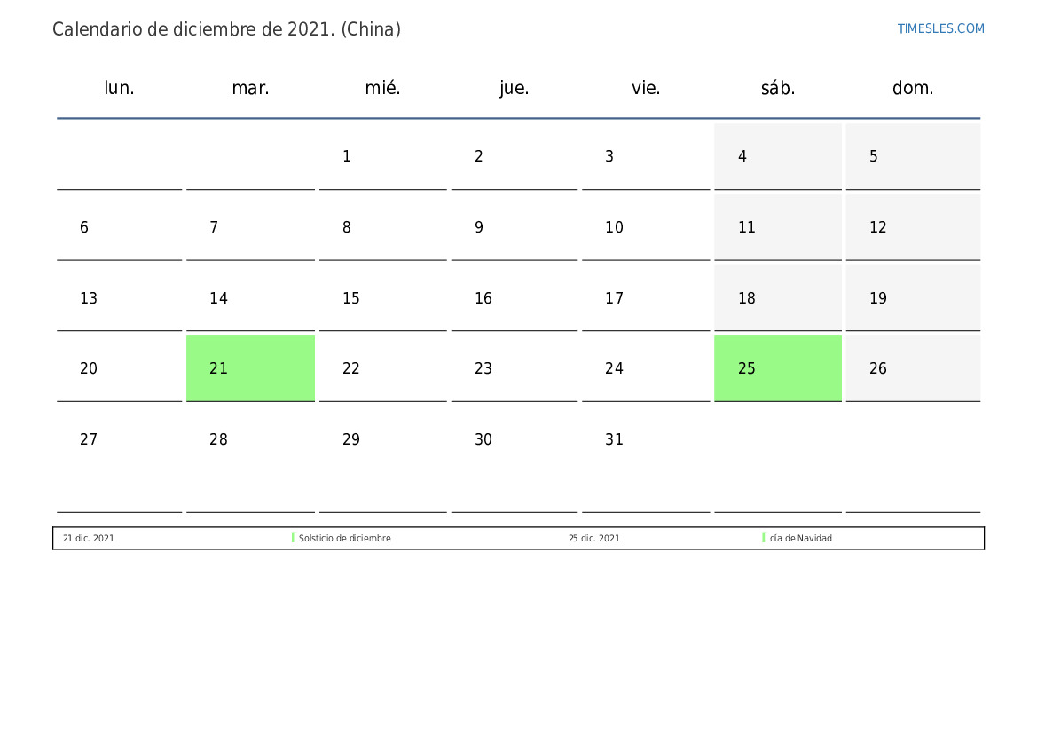 Calendario de feriados y fines de semana de diciembre de 2021 para China