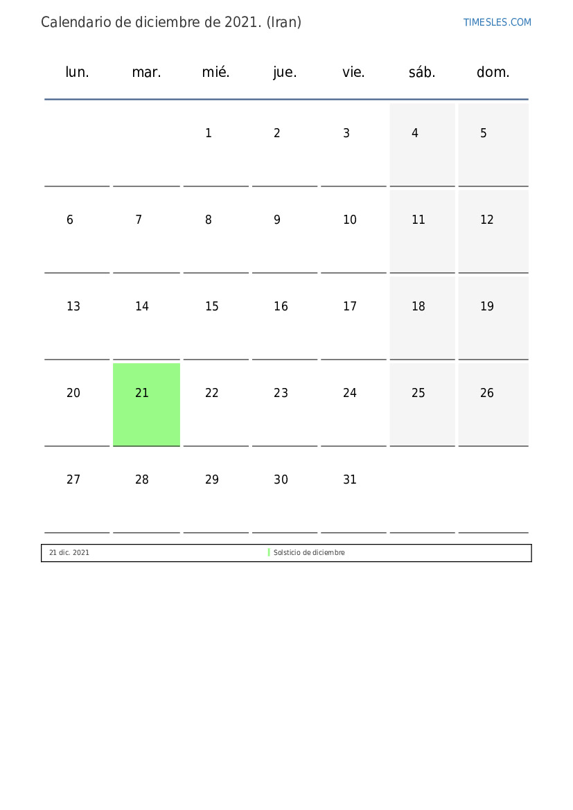 Calendario de feriados y fines de semana de diciembre de 2021 para Irán