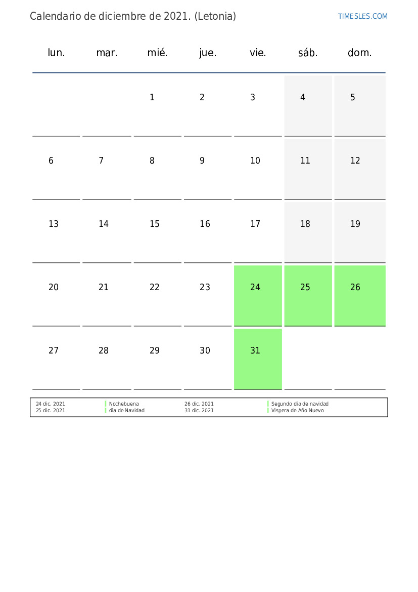 Calendario de feriados y fines de semana de diciembre de 2021 para Letonia