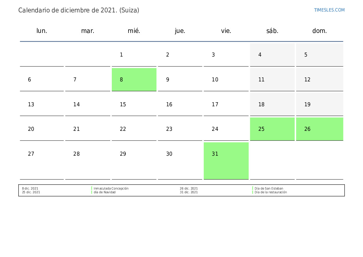 Calendario de feriados y fines de semana de diciembre de 2021 para Suiza