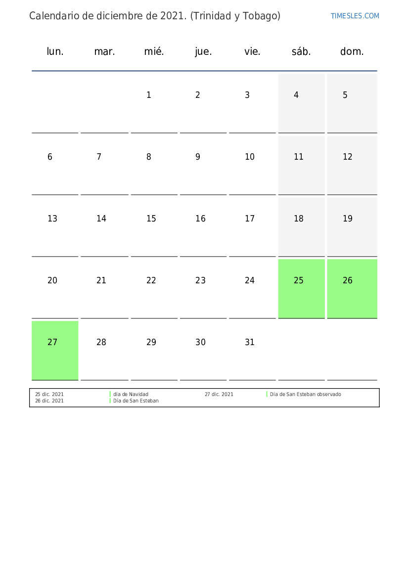 Calendario de feriados y fines de semana de diciembre de 2021 para Trinidad y Tobago