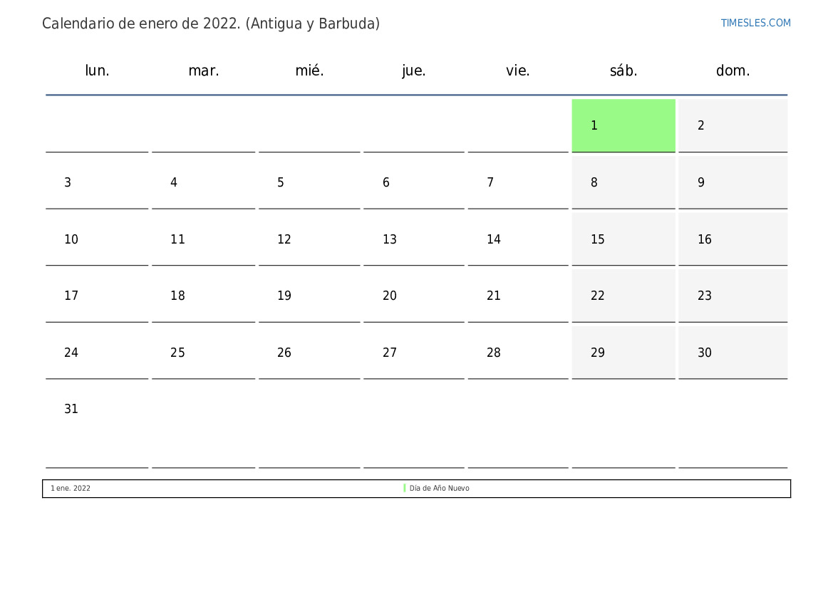 El mes de enero contiene 31 días. Este es 1 mes de 2022. Temporada del año: invierno. El mes de enero comienza en sábado y termina el lunes. En el mes de enero de enero, hay 1 feriado y día libre en Antigua y Barbuda.