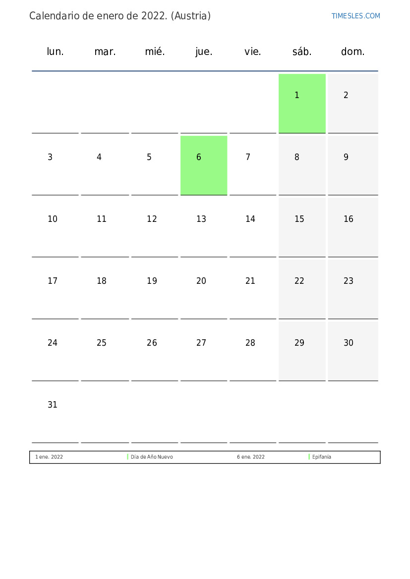 Calendario de feriados y fines de semana de enero de 2022 para Austria