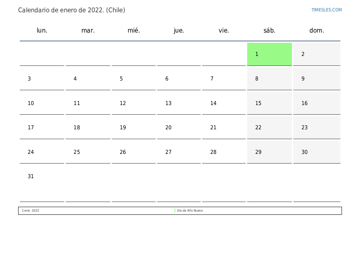 El mes de enero contiene 31 días. Este es 1 mes de 2022. Temporada del año: invierno. El mes de enero comienza en sábado y termina el lunes. En el mes de enero de enero, hay 1 feriado y día libre en Chile.