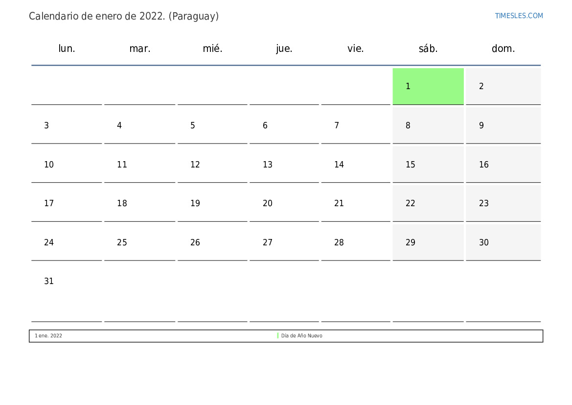 El mes de enero contiene 31 días. Este es 1 mes de 2022. Temporada del año: invierno. El mes de enero comienza en sábado y termina el lunes. En el mes de enero de enero, hay 1 feriado y día libre en Paraguay.