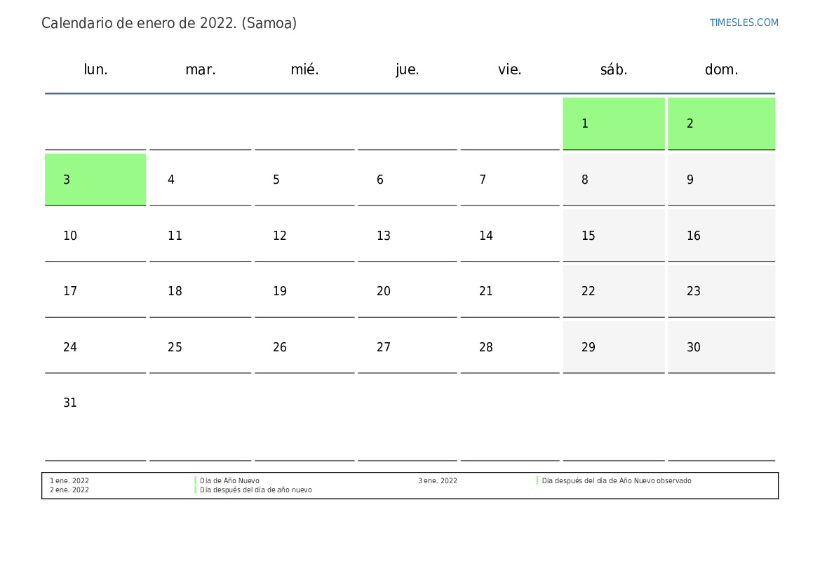 Calendario de feriados y fines de semana de enero de 2022 para Samoa