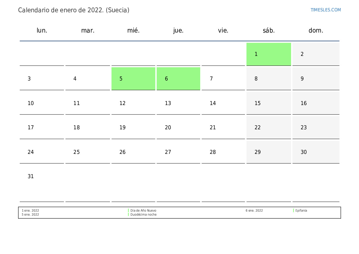Calendario de feriados y fines de semana de enero de 2022 para Suecia