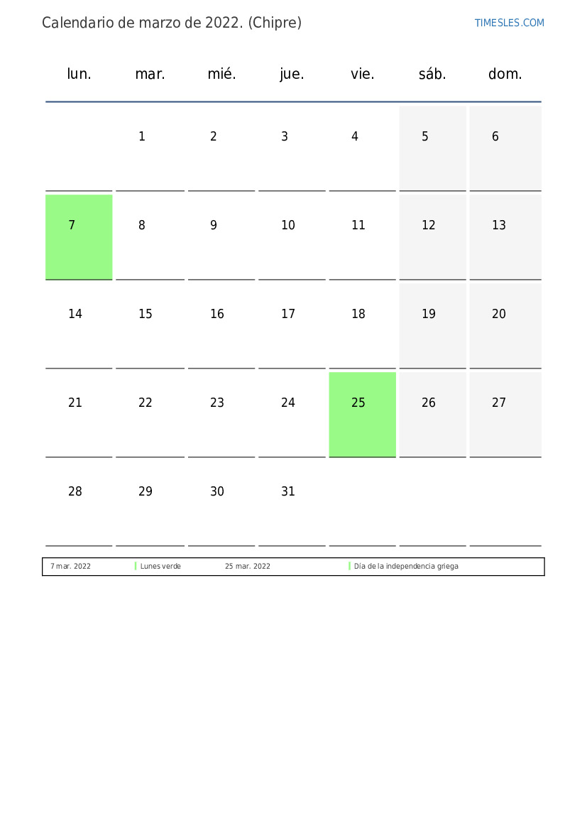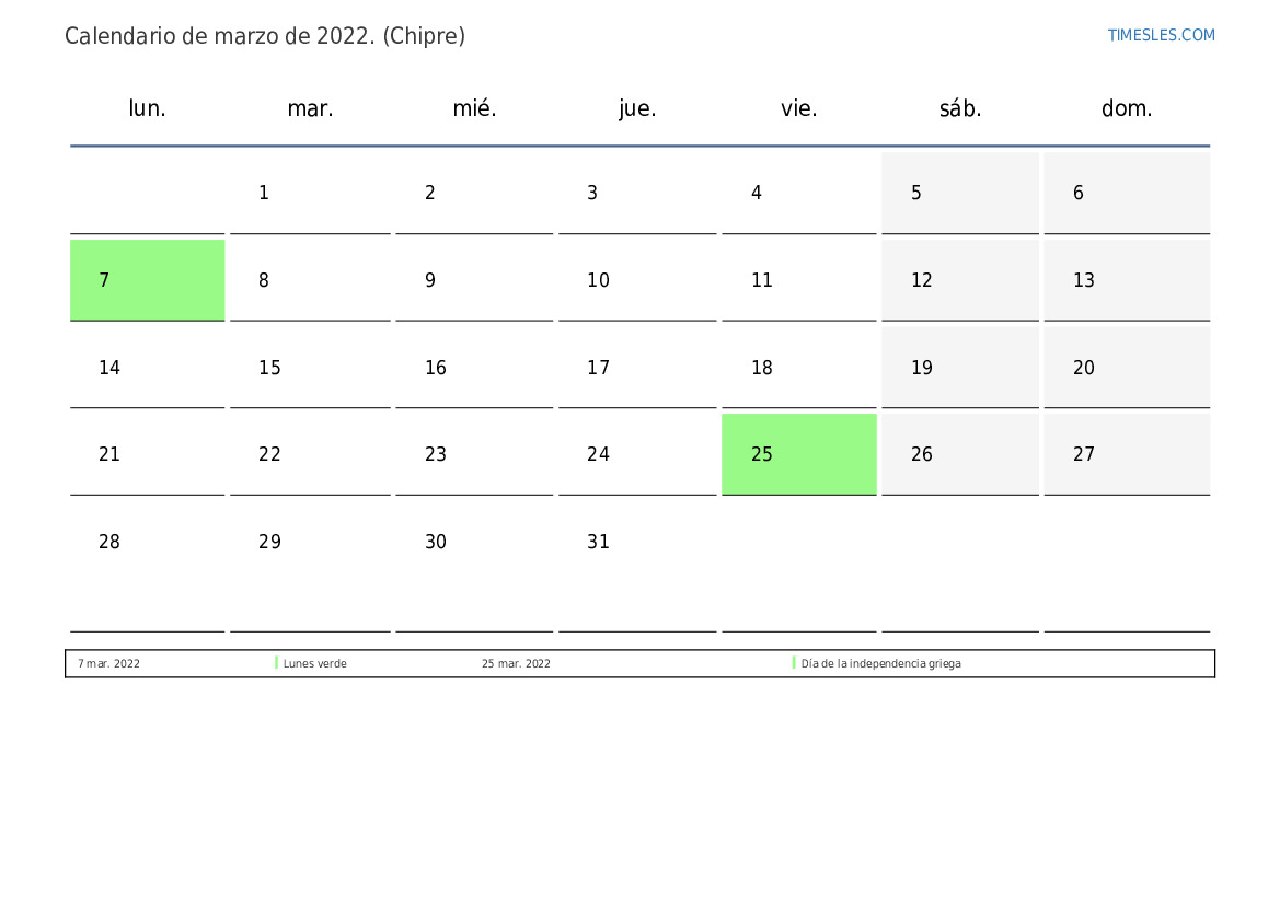 Calendario de feriados y fines de semana de marzo de 2022 para Chipre