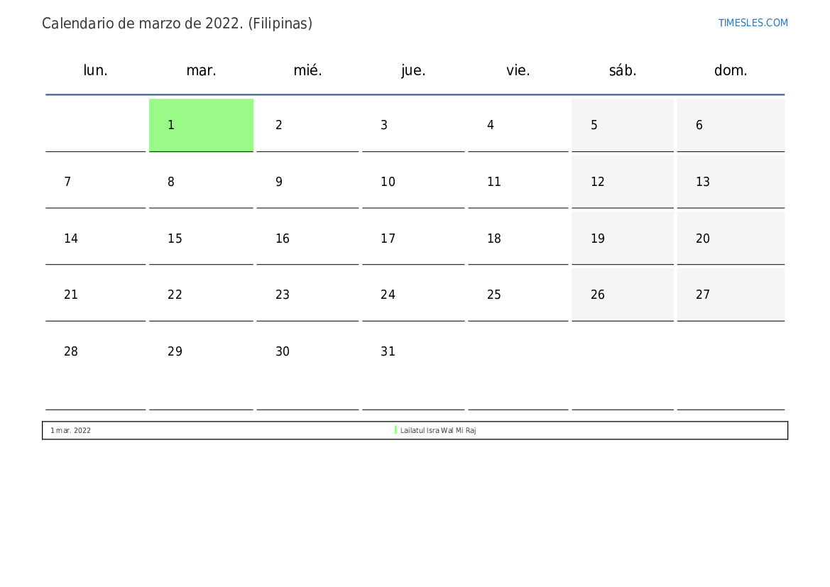 El mes de marzo contiene 31 días. Este es 3 mes de 2022. Temporada del año: primavera. El mes de marzo comienza el martes y termina el jueves. En el mes de marzo de marzo, hay 2 feriados y días libres En Filipinas.