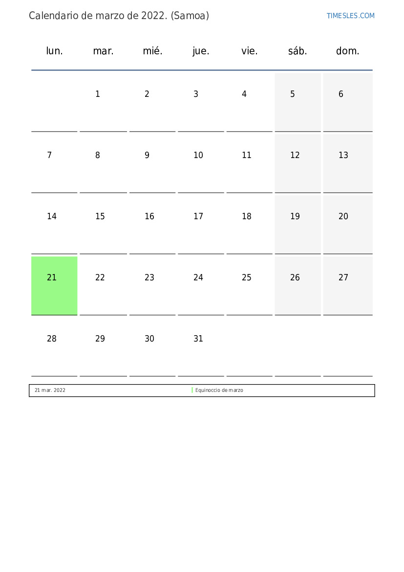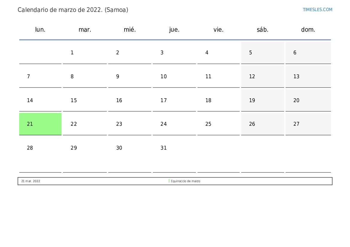 Calendario de feriados y fines de semana de marzo de 2022 para Samoa