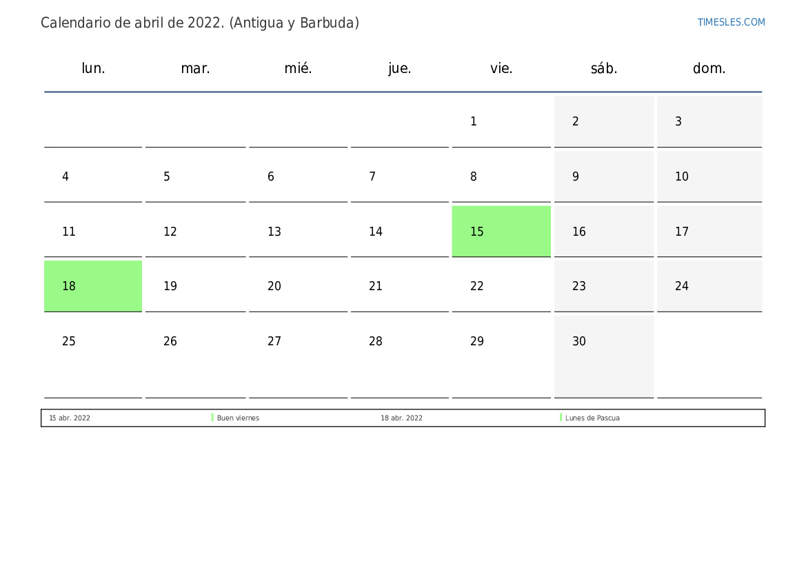 Calendario abril 2022 para Antigua y Barbuda
