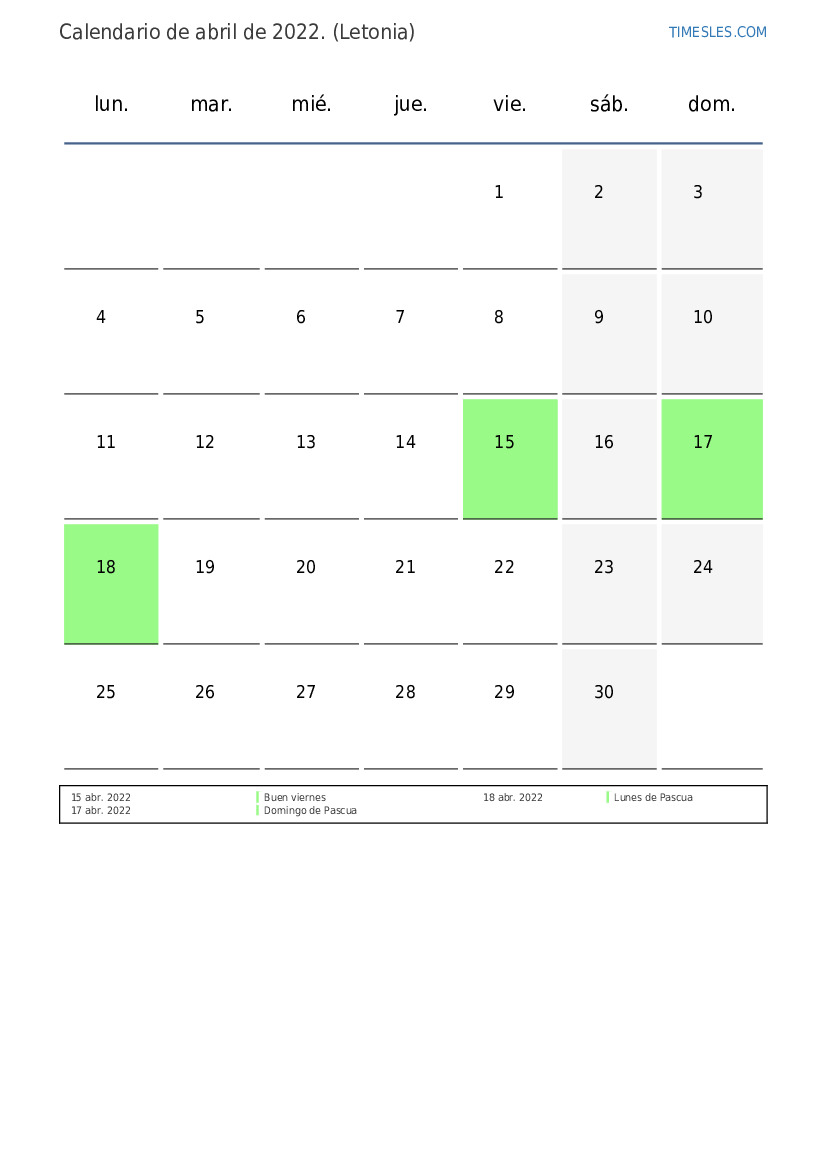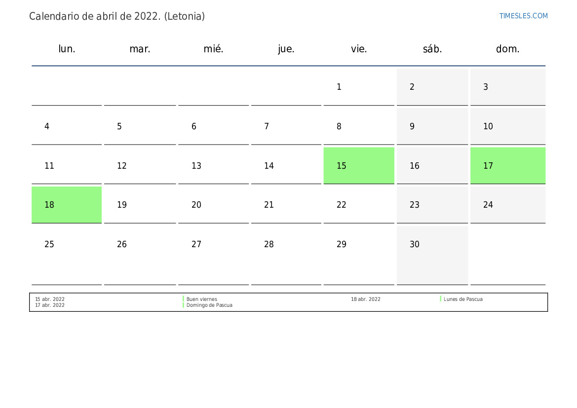 Calendario de feriados y fines de semana de abril de 2022 para Letonia