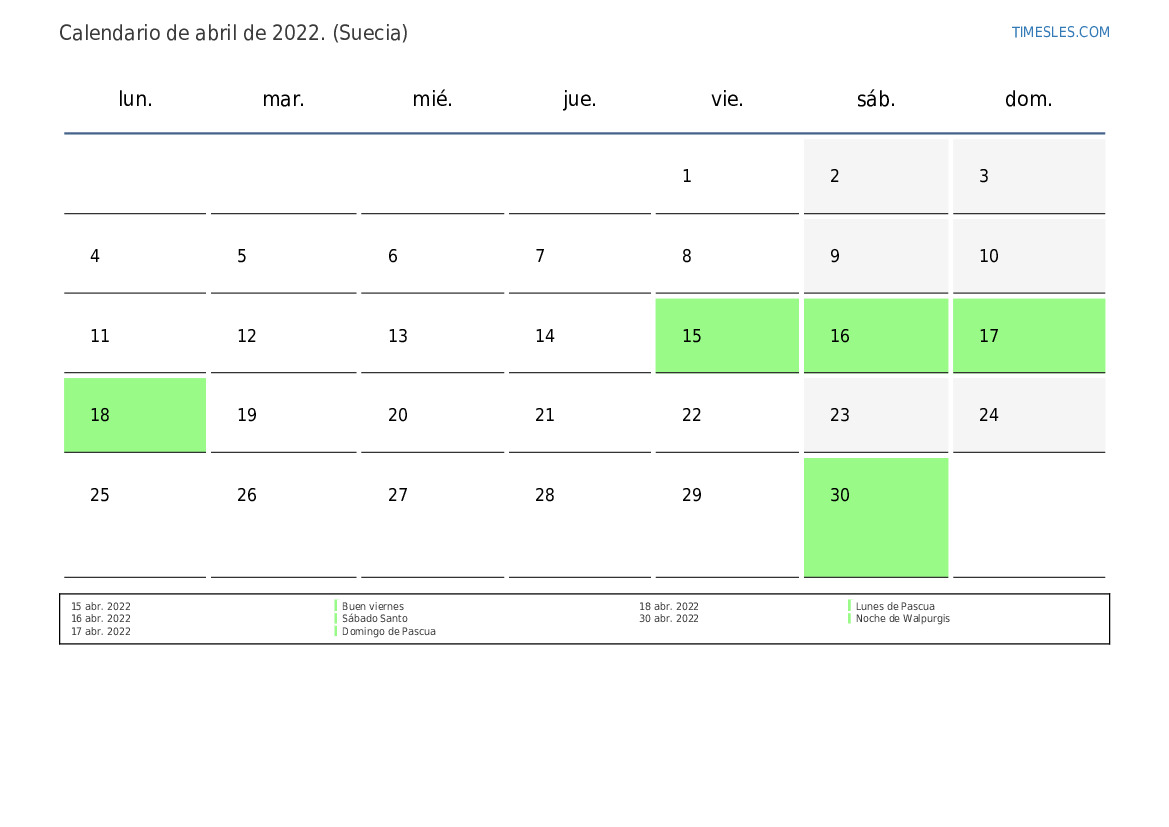 Calendario de feriados y fines de semana de abril de 2022 para Suecia