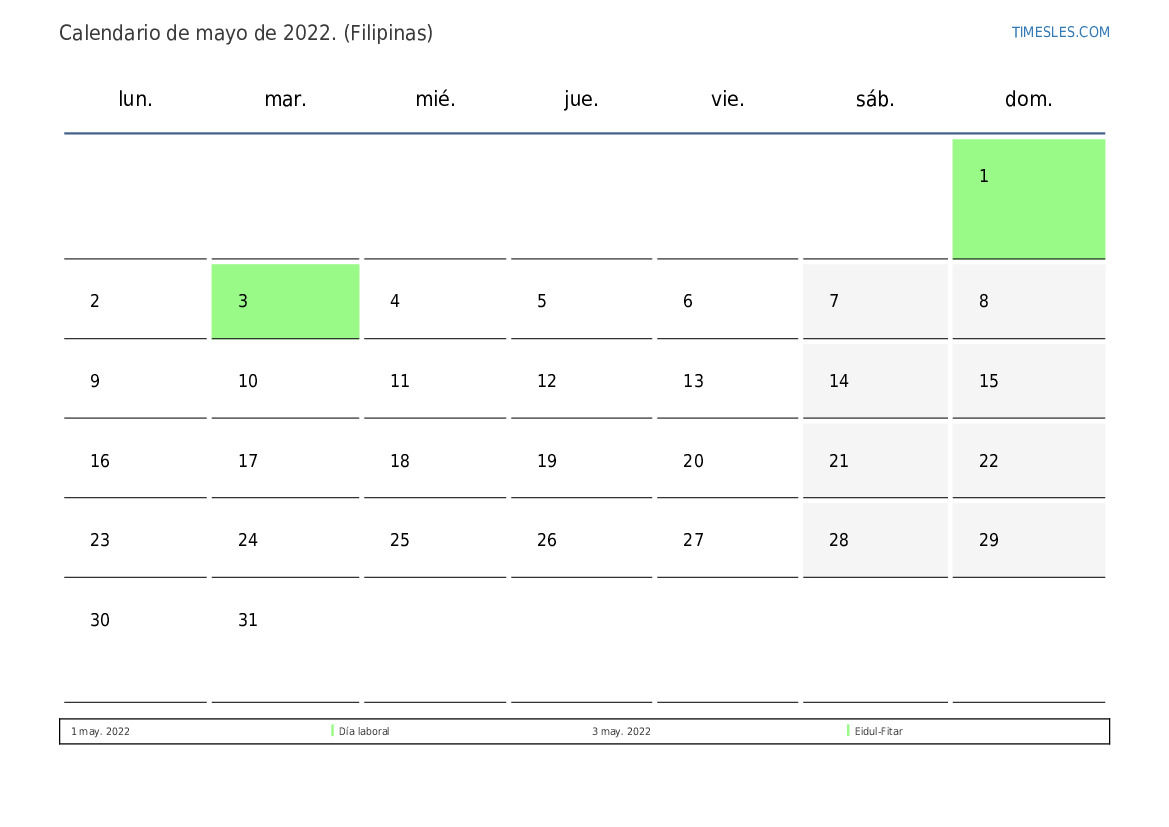 Calendario de feriados y fines de semana de mayo de 2022 para Filipinas
