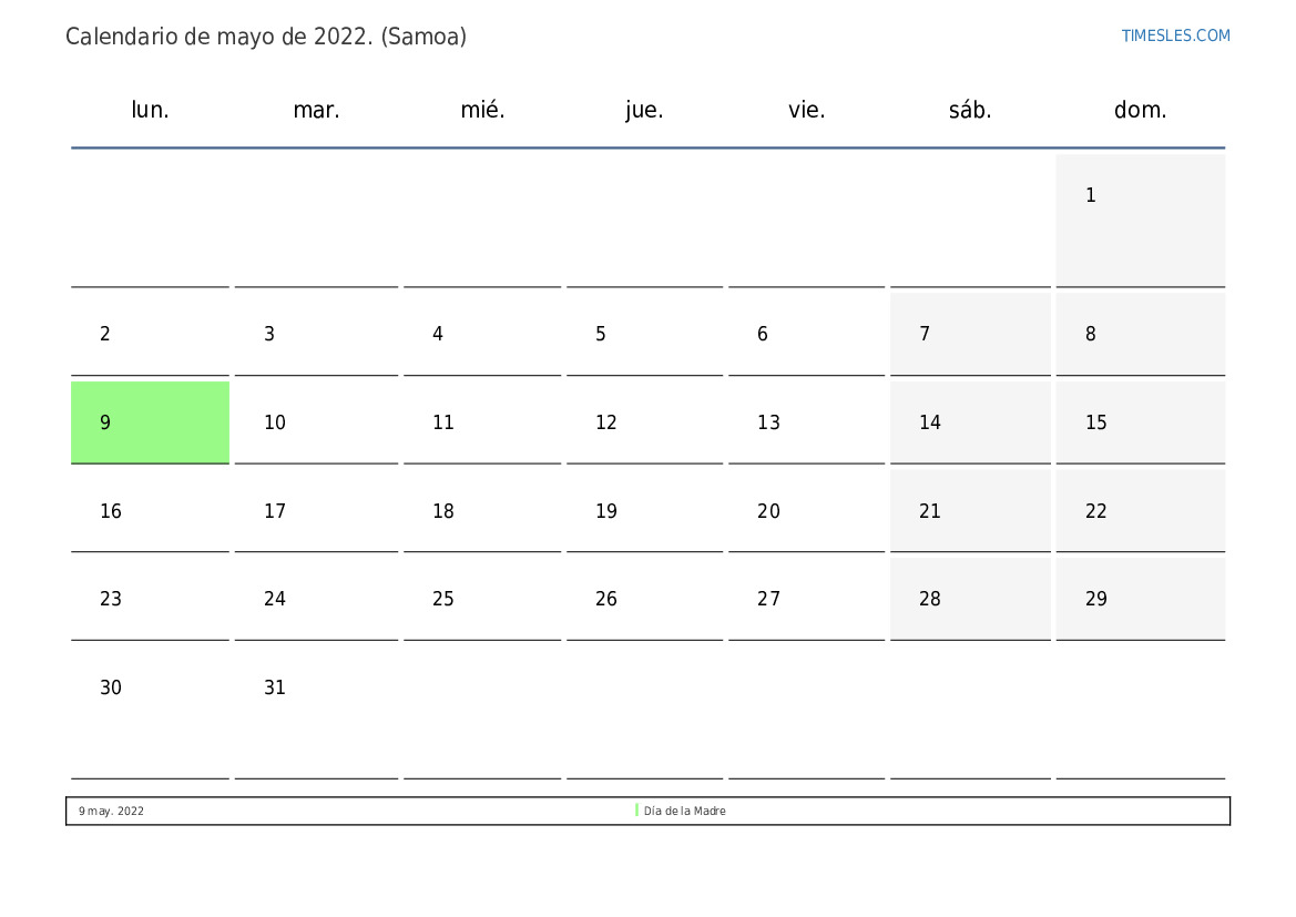 El mes de mayo contiene 31 días. Este es 5 mes de 2022. Temporada del año: primavera. El mes de mayo comienza el domingo y termina el martes. En el mes de mayo de mayo, hay 1 feriado y día libre en Samoa.