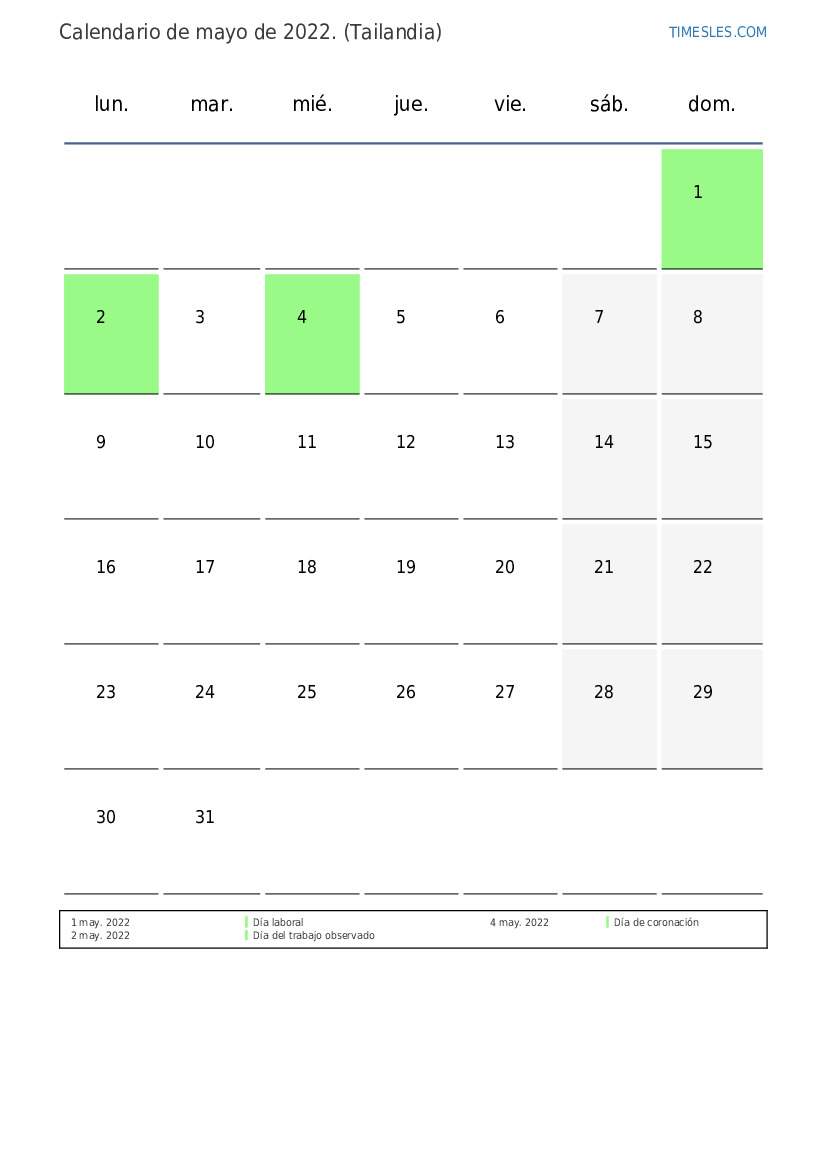 El mes de mayo contiene 31 días. Este es 5 mes de 2022. Temporada del año: primavera. El mes de mayo comienza el domingo y termina el martes. En el mes de mayo de mayo, hay 3 feriados y días libres En Tailandia.