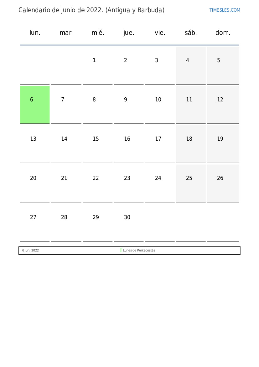 Descargue e imprima el calendario en PDF con feriados y fines de semana de junio de 2022 para Antigua y Barbuda