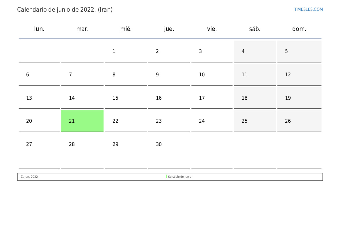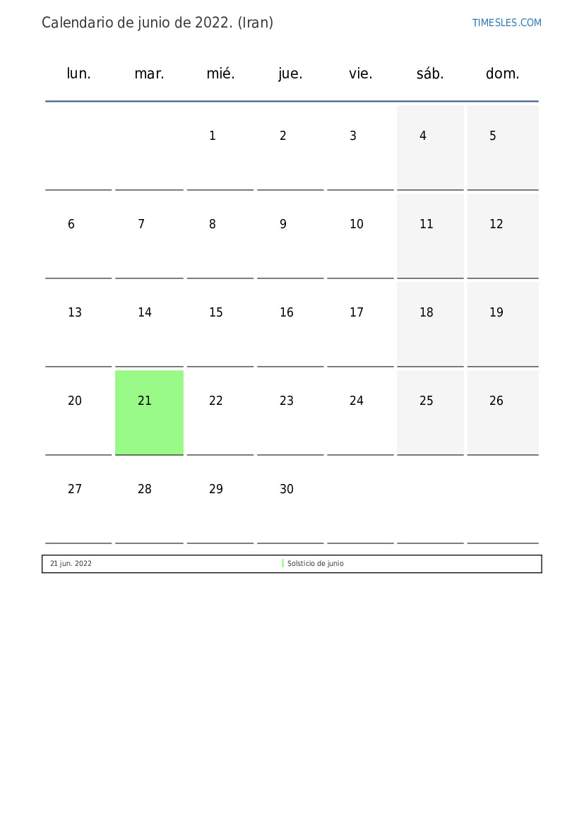 Calendario de feriados y fines de semana de junio de 2022 para Irán
