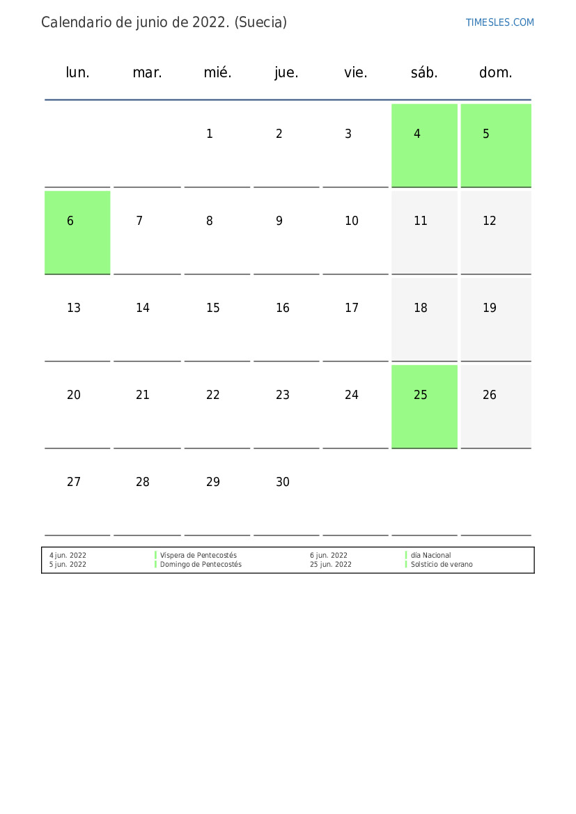 Calendario de feriados y fines de semana de junio de 2022 para Suecia