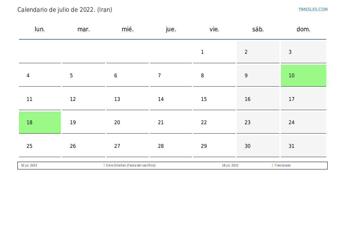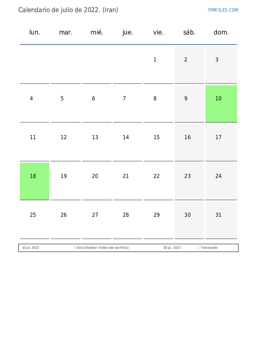 Calendario de feriados y fines de semana de julio de 2022 para Irán
