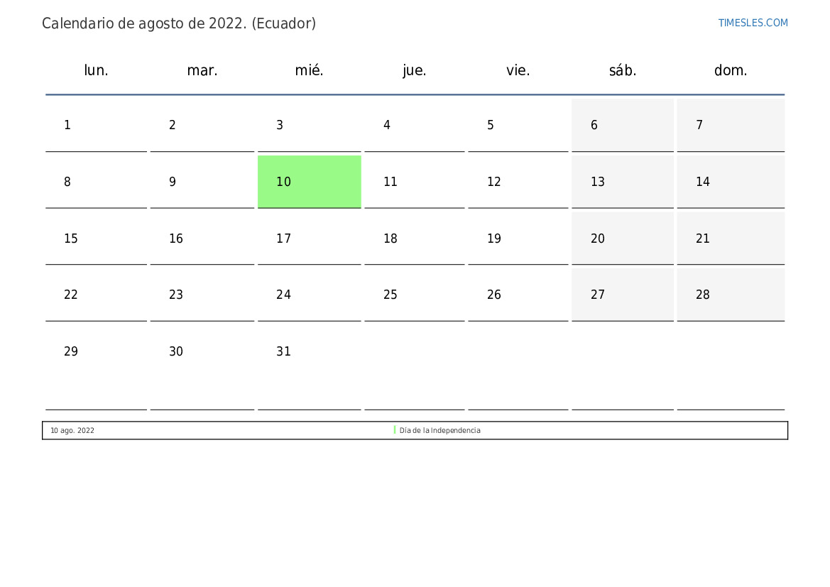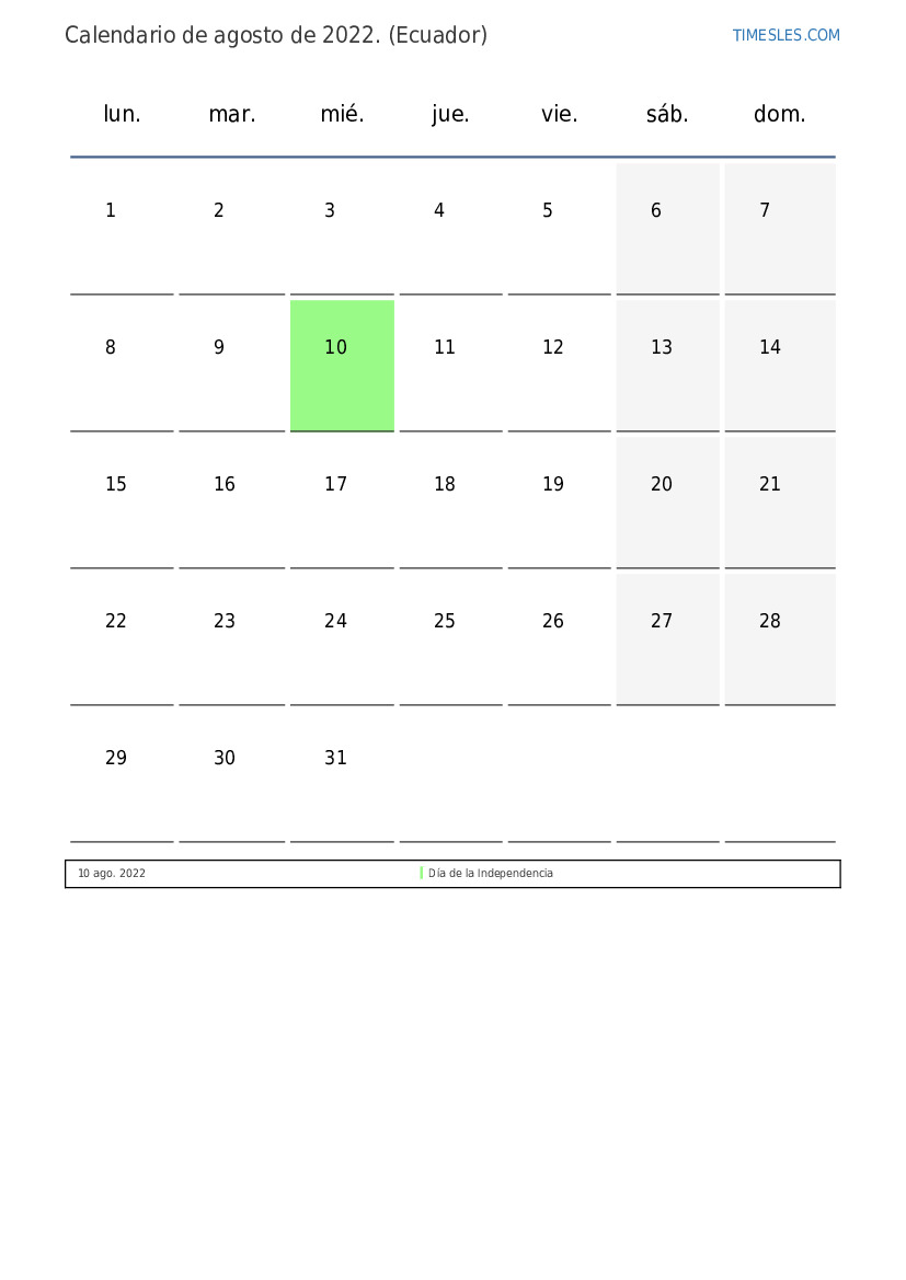 Calendario de feriados y fines de semana de agosto de 2022 para Ecuador