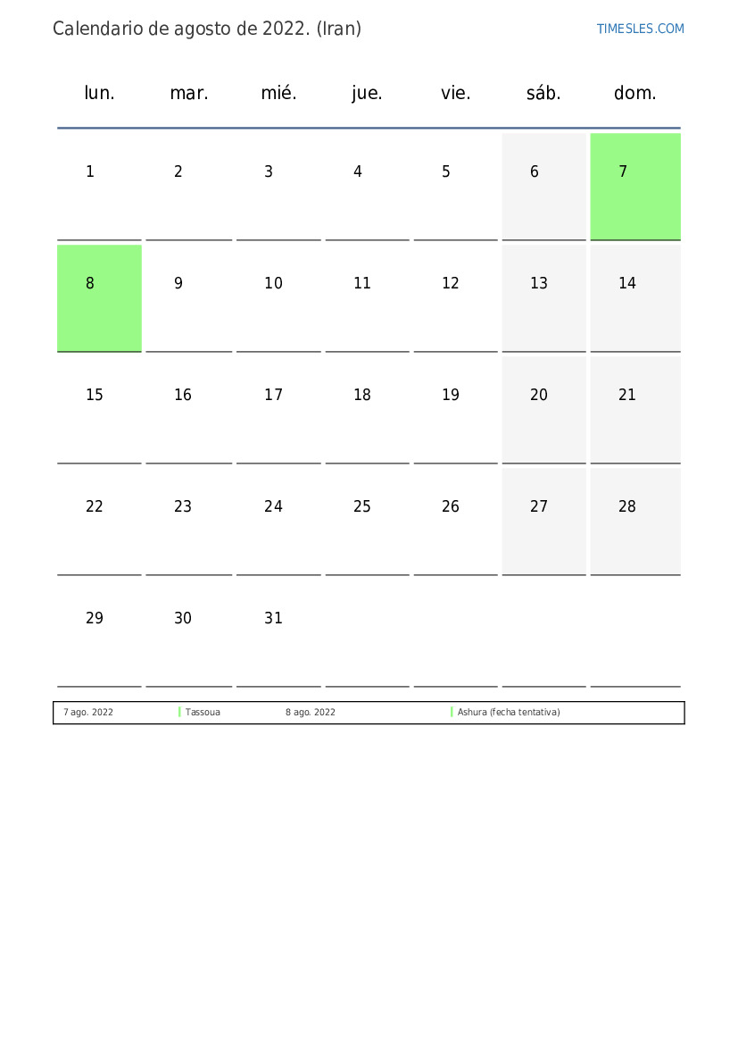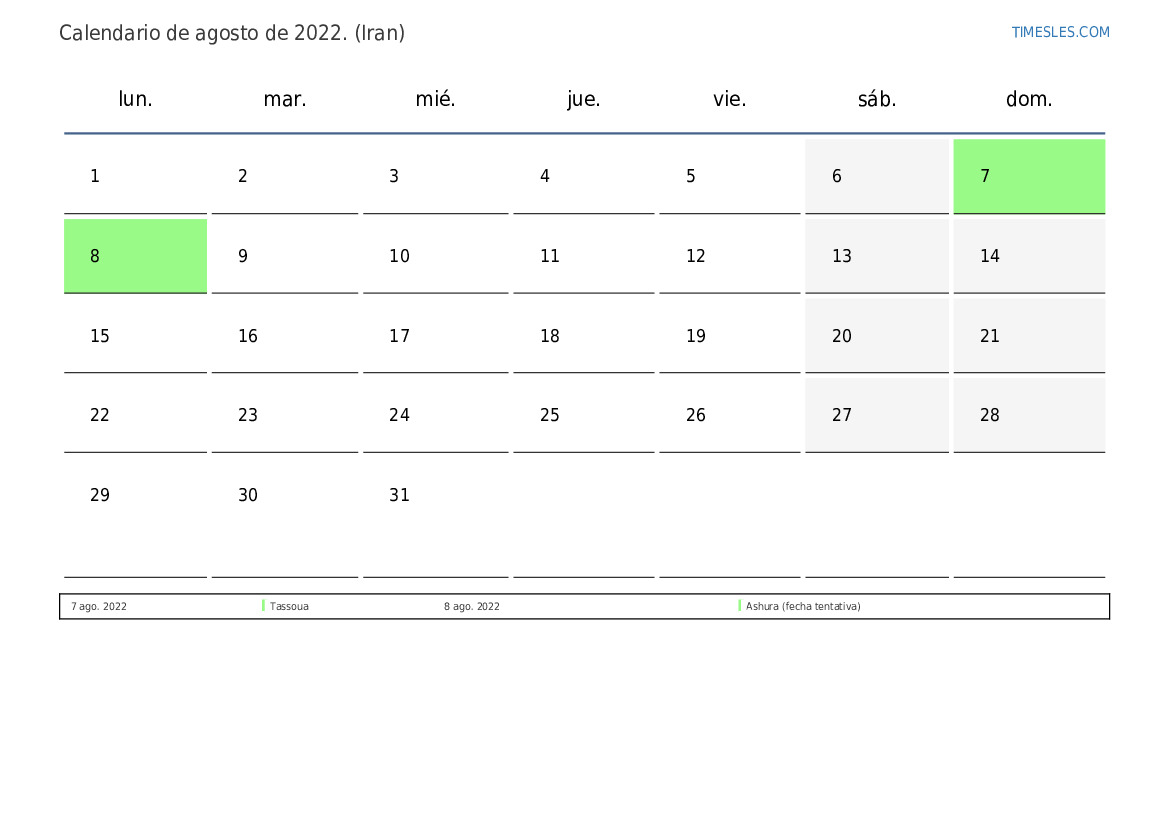 Calendario de feriados y fines de semana de agosto de 2022 para Irán