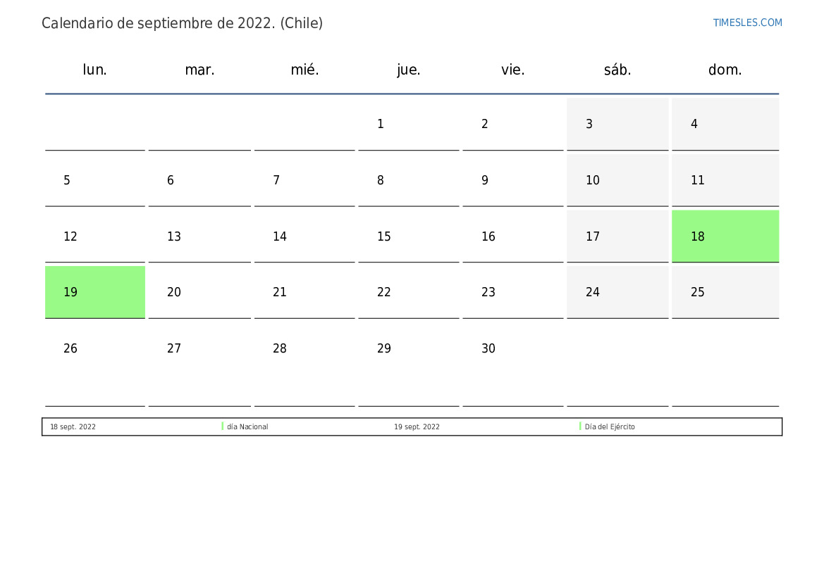 El mes de septiembre contiene 30 días. Este es 9 mes de 2022. Temporada del año: otoño. El mes de septiembre comienza el jueves y termina el viernes. En el mes de septiembre de septiembre, hay 3 feriados y días libres en Chile.