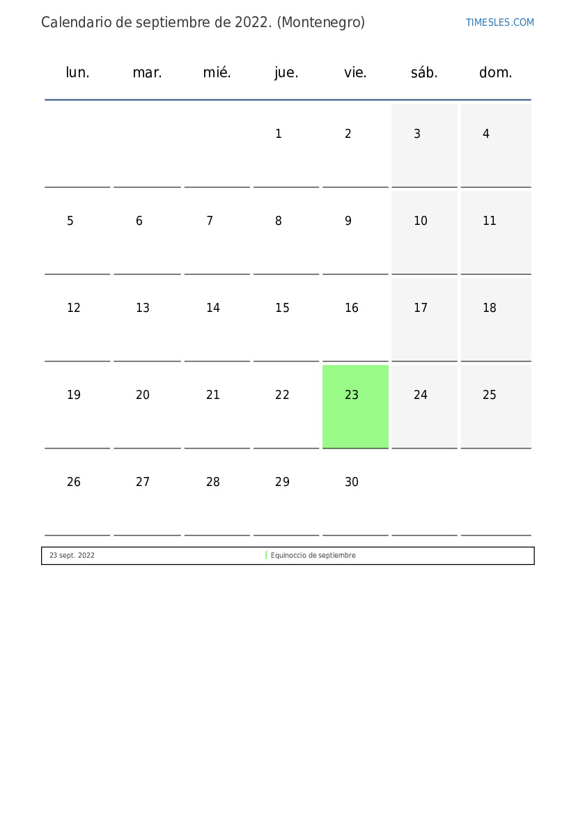 El mes de septiembre contiene 30 días. Este es 9 mes de 2022. Temporada del año: otoño. El mes de septiembre comienza el jueves y termina el viernes. En el mes de septiembre de septiembre, hay 1 feriado y día libre en montenegro.