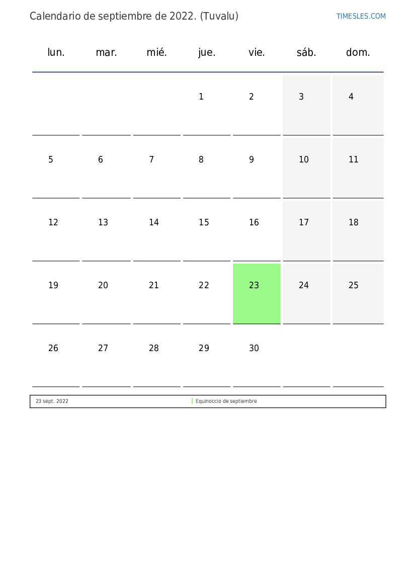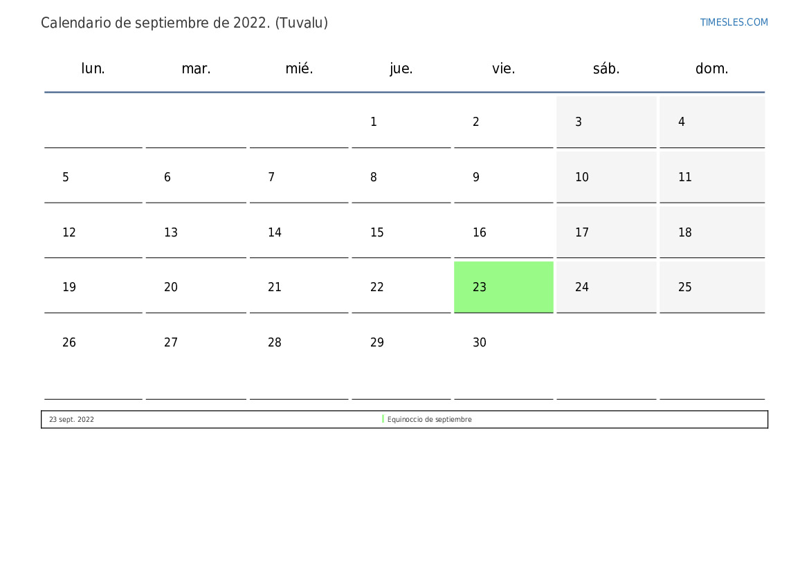 El mes de septiembre contiene 30 días. Este es 9 mes de 2022. Temporada del año: otoño. El mes de septiembre comienza el jueves y termina el viernes. En el mes de septiembre de septiembre, hay 1 feriado y día libre en Tuvalu.