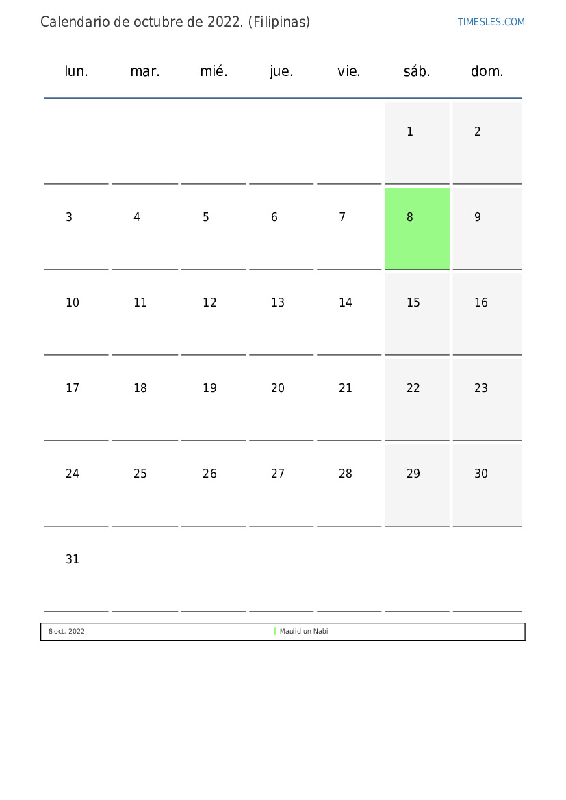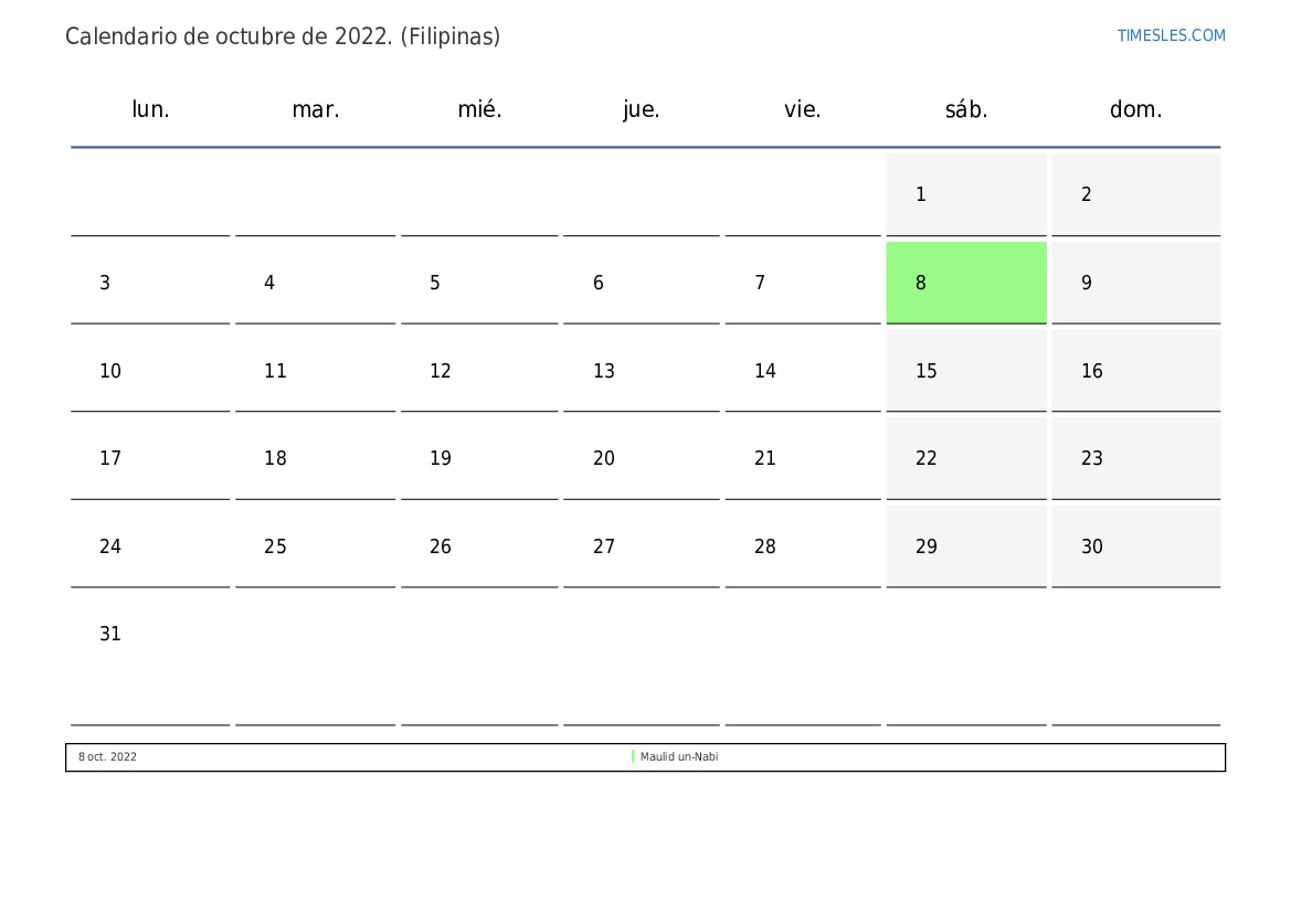 El mes de octubre contiene 31 días. Este es 10 mes de 2022. Temporada del año: otoño. El mes de octubre comienza en sábado y termina el lunes. En el mes de octubre de octubre, hay 1 feriado y día libre En Filipinas.