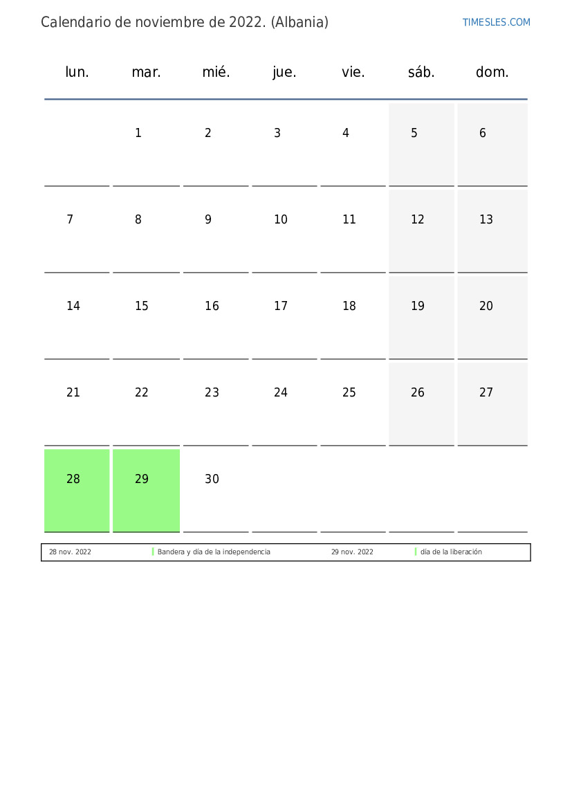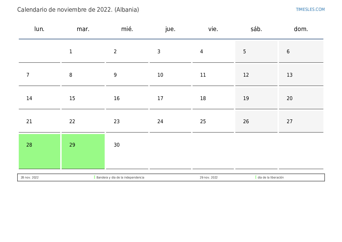 Calendario de feriados y fines de semana de noviembre de 2022 para Albania