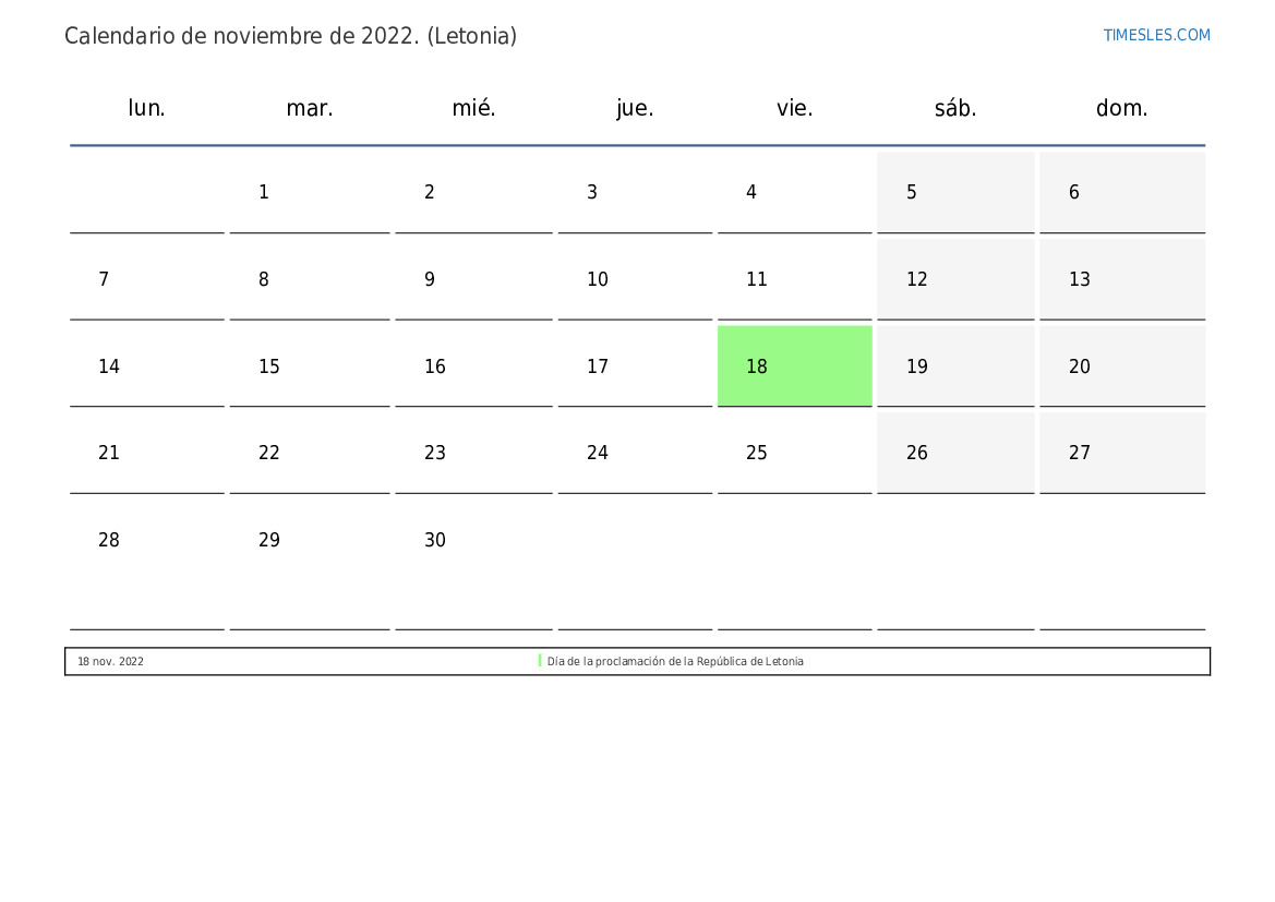 Calendario de feriados y fines de semana de noviembre de 2022 para Letonia
