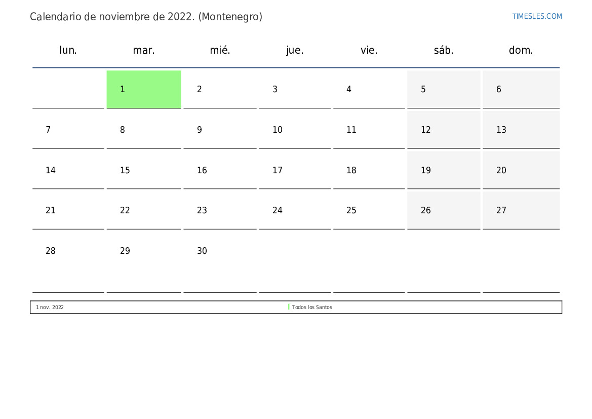 El mes de noviembre contiene 30 días. Este es 11 mes de 2022. Temporada del año: otoño. El mes de noviembre comienza el martes y termina el miércoles. En el mes de noviembre de noviembre, hay 1 feriado y día libre en montenegro.