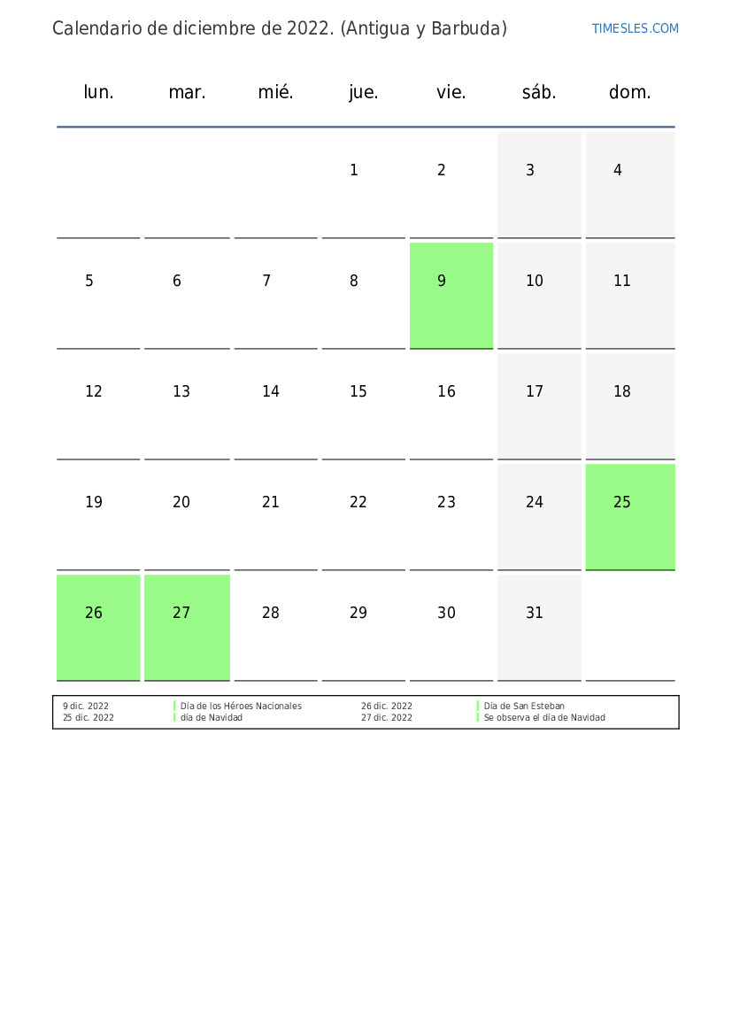Calendario de feriados y fines de semana de diciembre de 2022 para Antigua y Barbuda