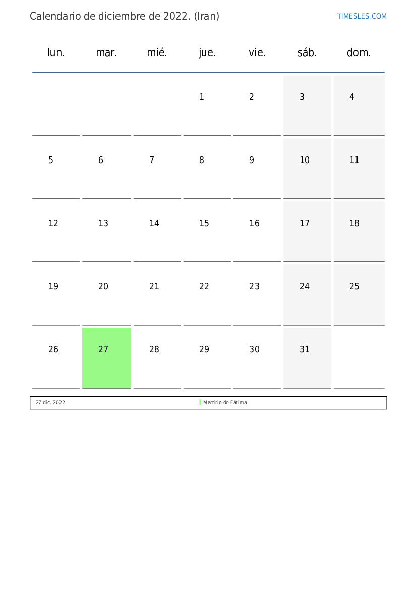 Calendario de feriados y fines de semana de diciembre de 2022 para Irán