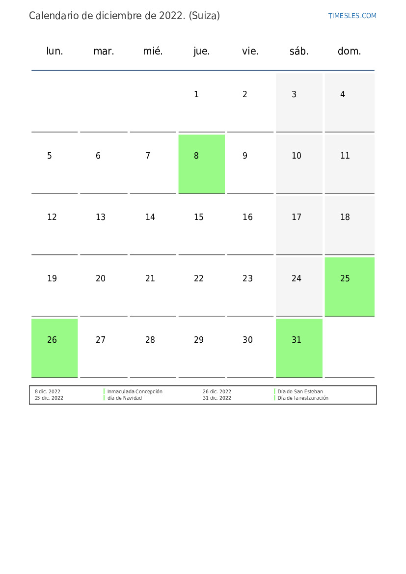 Calendario de feriados y fines de semana de diciembre de 2022 para Suiza