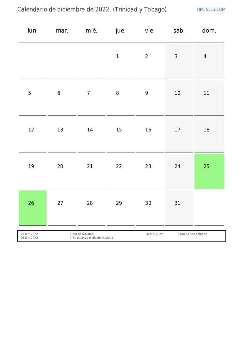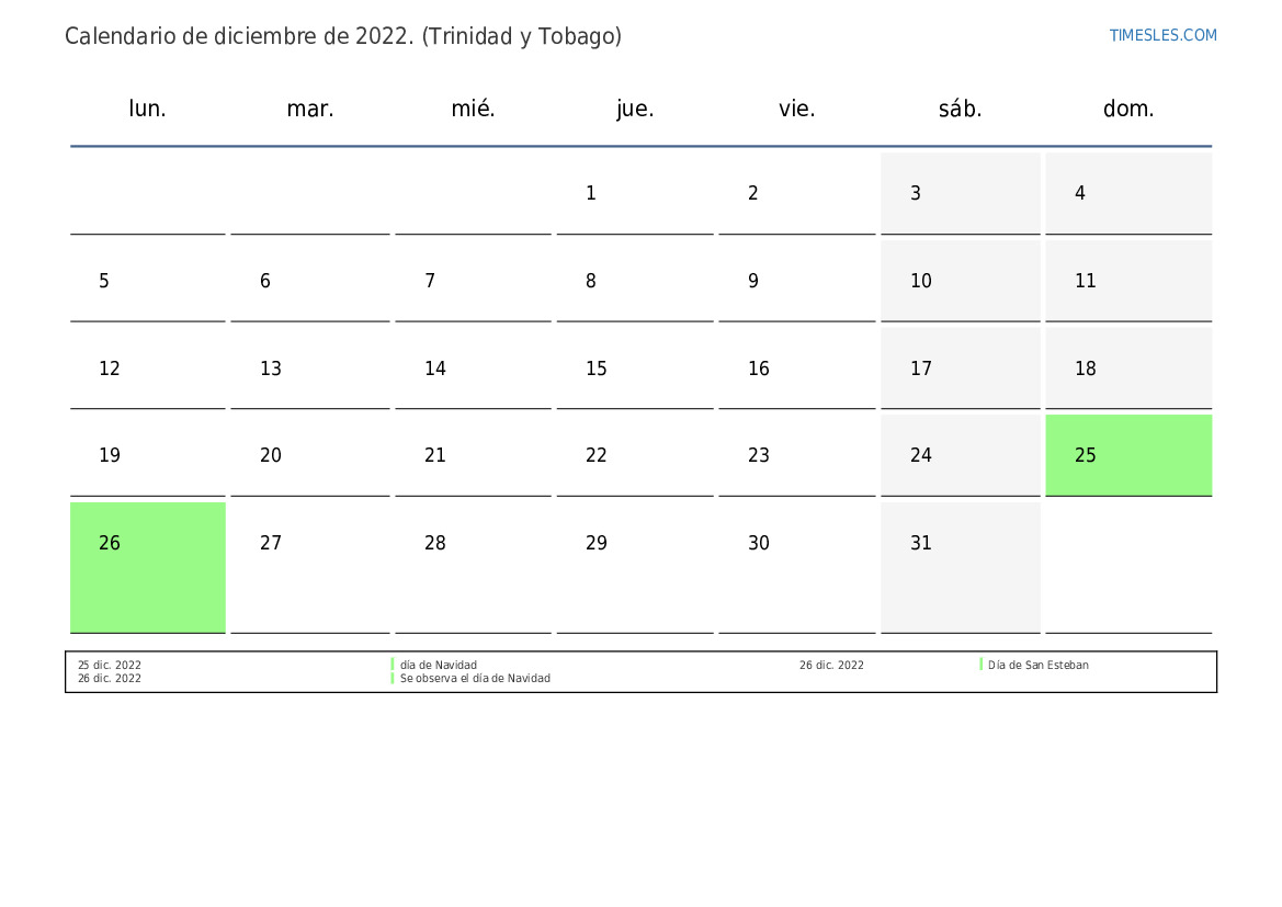 Descargue e imprima el calendario en PDF con feriados y fines de semana de diciembre de 2022 para Trinidad y Tobago