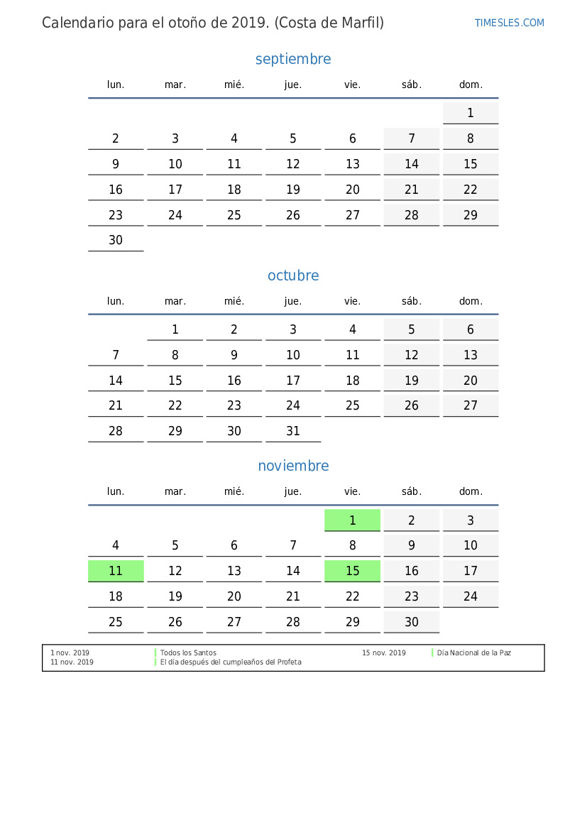 Descargue e imprima el calendario en PDF con festivos y fines de semana para el otoño de 2019 para Cote d'Ivoire