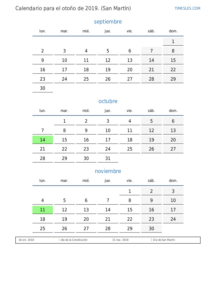 Descargue e imprima el calendario en PDF con festivos y fines de semana para el otoño de 2019 para Sint Maarten